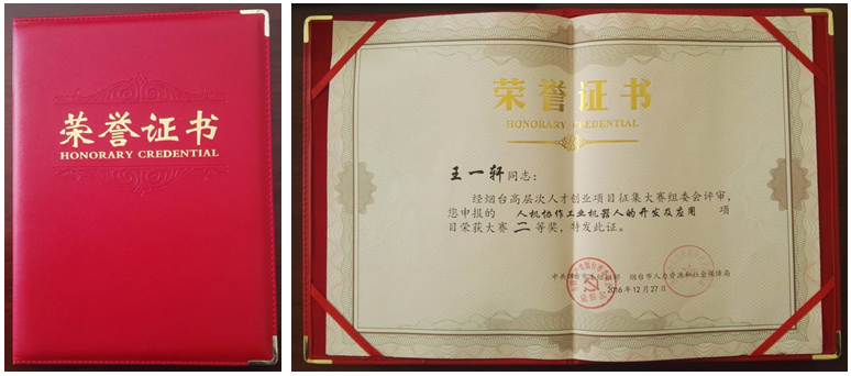 2016年12月27日,煙臺(tái)市高層次人才創(chuàng)新創(chuàng)業(yè)項(xiàng)目大賽在市中心大酒店隆重舉行,經(jīng)過激烈角逐,我公司王一軒博士申報(bào)的《人機(jī)協(xié)作機(jī)器人的開發(fā)與應(yīng)用》在165個(gè)參賽項(xiàng)目中脫穎而出,榮獲大賽二等獎(jiǎng)(共5名)